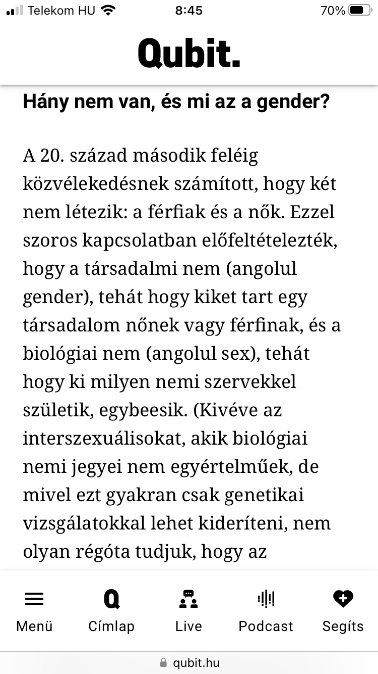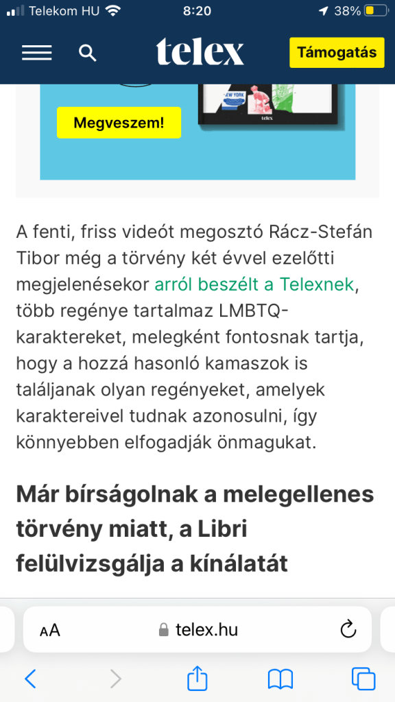Egy kis “jaj, a fólia!” cikk, ömlengés. Két pszichológus. Nyilván a szülők, idegen felnőttek szexuális jótanácsai, ja és A NETFLIX nélkül a gyerekek teljesen el vannak veszve, nagyon fontos, hogy már kiskortól firtassuk ezt a témát és használjuk a kuki, puni szavakat. Megint említést sem tesznek se a pornóról, se a nőgyűlöletről, se a groomingról (amikor idegen felnőttek vagy akár rokonok “beszélgetnek”, azaz nagyon akarják tudni, hogy a gyerekekkel mi van szexuálisan, testileg), pedig az az igazi veszély. https://telex.hu/velemeny/2023/09/29/a-foliazas-felelem-szorongas-velemeny-lmbtq-konyvek-nyul-boglarka-peer-krisztina A fólia mint intézkedés nem túl értelmes (mondjuk nem is a törvény találta ki, az csak elkülönítést és zárt csomagolást említ), nem okoz semmit (nem véd meg és nem is korlátoz, majd a könyvkereskedők parája kiszelektálja a legcikibb szexre, önmegvalósítós butulásra rádumálós könyveket), de a queerpropaganda ellen fellépni fontos. Jó esetben fölösleges látszattéma, de rengeteg a hazugság, elkendőzés, pl. hogy csak egy ártalmatlan másság, viszont káros jelenségek járnak vele, éspedig inherensen, azaz nem csak a túlkapás vagy a visszaélés okozza. És ezeket soha nem ismerik el.