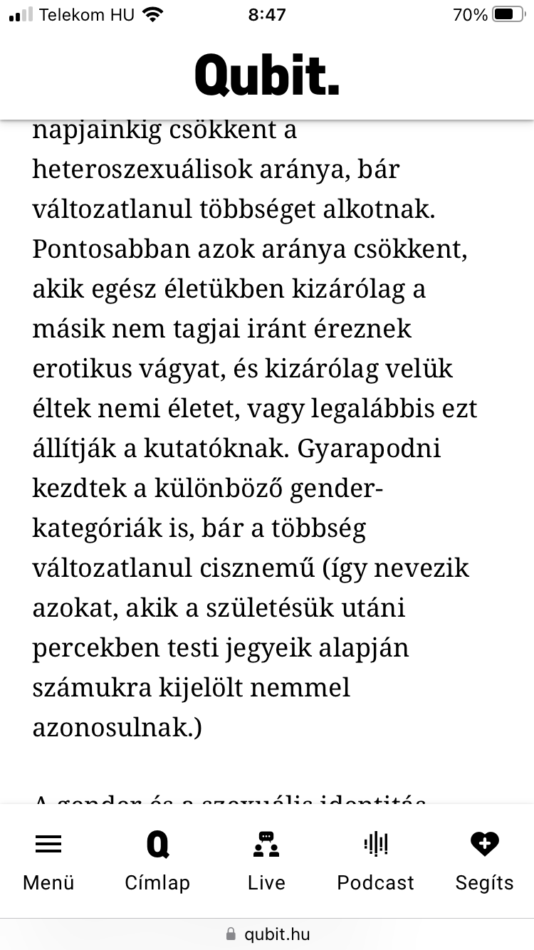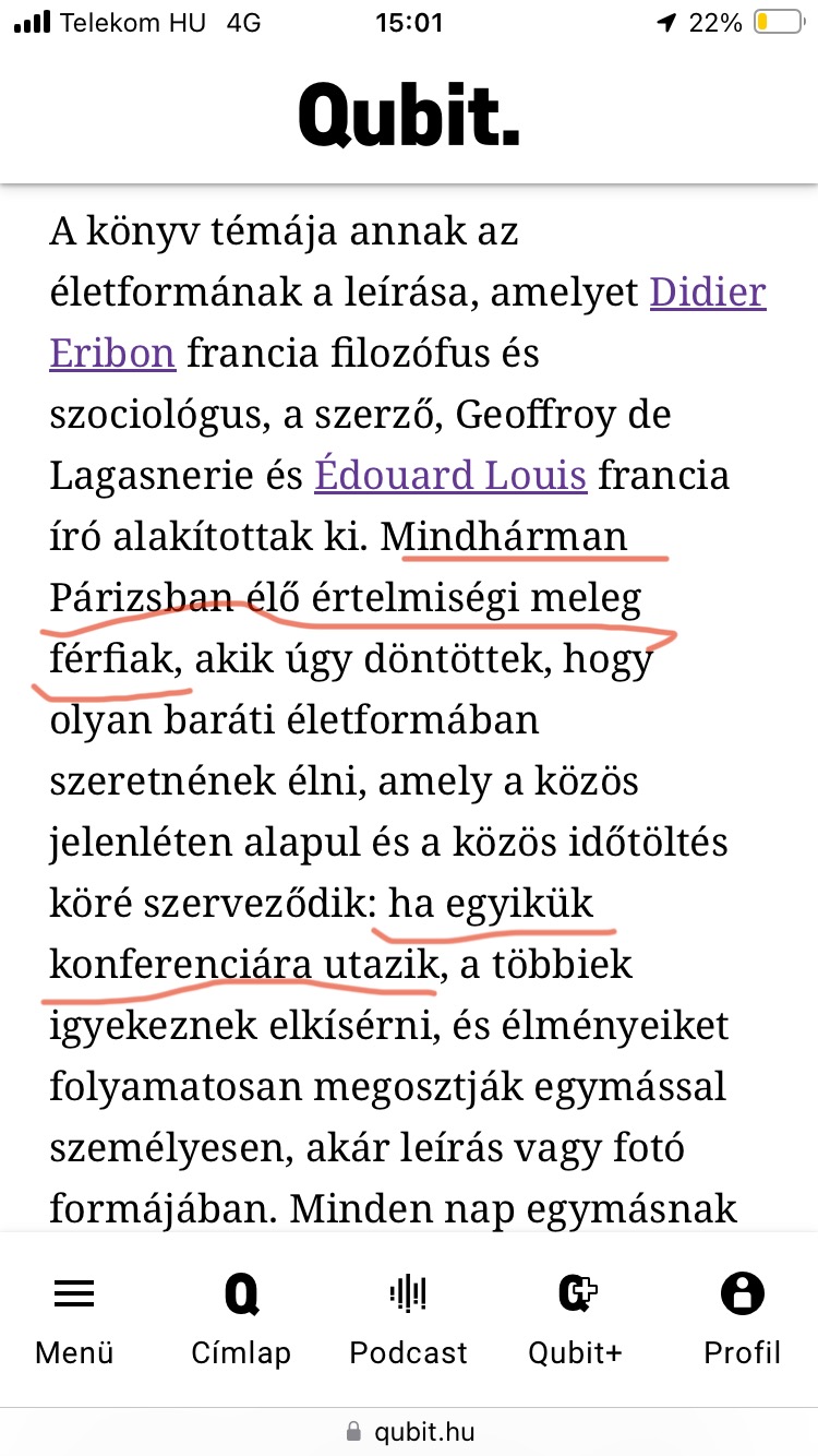 Ezt a “tudományos” (qubitos) cikket a 444 főoldalon hozza. Egy “filozófus” frusztrált egotripje (én így szállok le a bicikliről!). Sokat elmond arról, milyen attitűddel, élményekkel lesz valaki meleg, mennyire fensőbbrendűnek gondolják az életvitelüket (miközben nem ismerik a családos emberekét). És vajon miért “homofób” a társadalom? Olyan kedves emberek, ők is csak élni szeretnének!