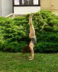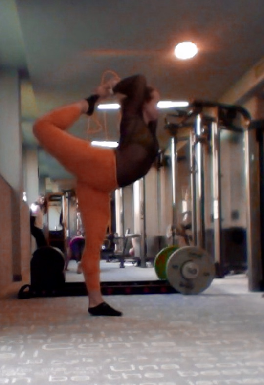Fejenállás, kézenállás. G. húzza föl a vállam, és kobrában a derekamra ül. Dancer’s pose. Spárgabemelegítés, bicepsz, spárga. Súlyzós donkey kick, oldalra is, 25-25 fajtánként és oldalanként.