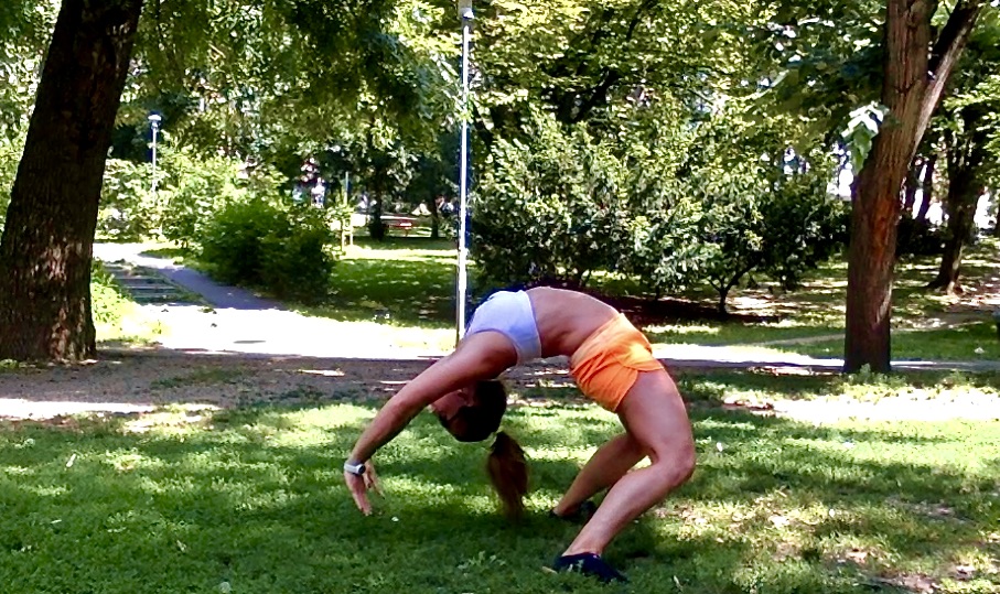 Híd, sok derékbejáratás előre-hátra. Kézenállásból híd, felállok. Híd labdával: a terpesz között gurítom, lemegyek, hátul elkapom, felállok vele. Erről ilyen fotó van: