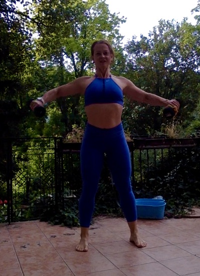 Utána 40 perc súlyzózás a teraszon, már a sötétben. Ass to grass guggolás, oldal- és előreemelés, bicepsz curl, korlátnál lábemelés hátra, felhúzás, fekve nyomás, tárogatás, hasprés, mindenből 100. Érzem az izmaim, feszes, edzett érzet. Holnap nyújtás, akrobatika jön.
