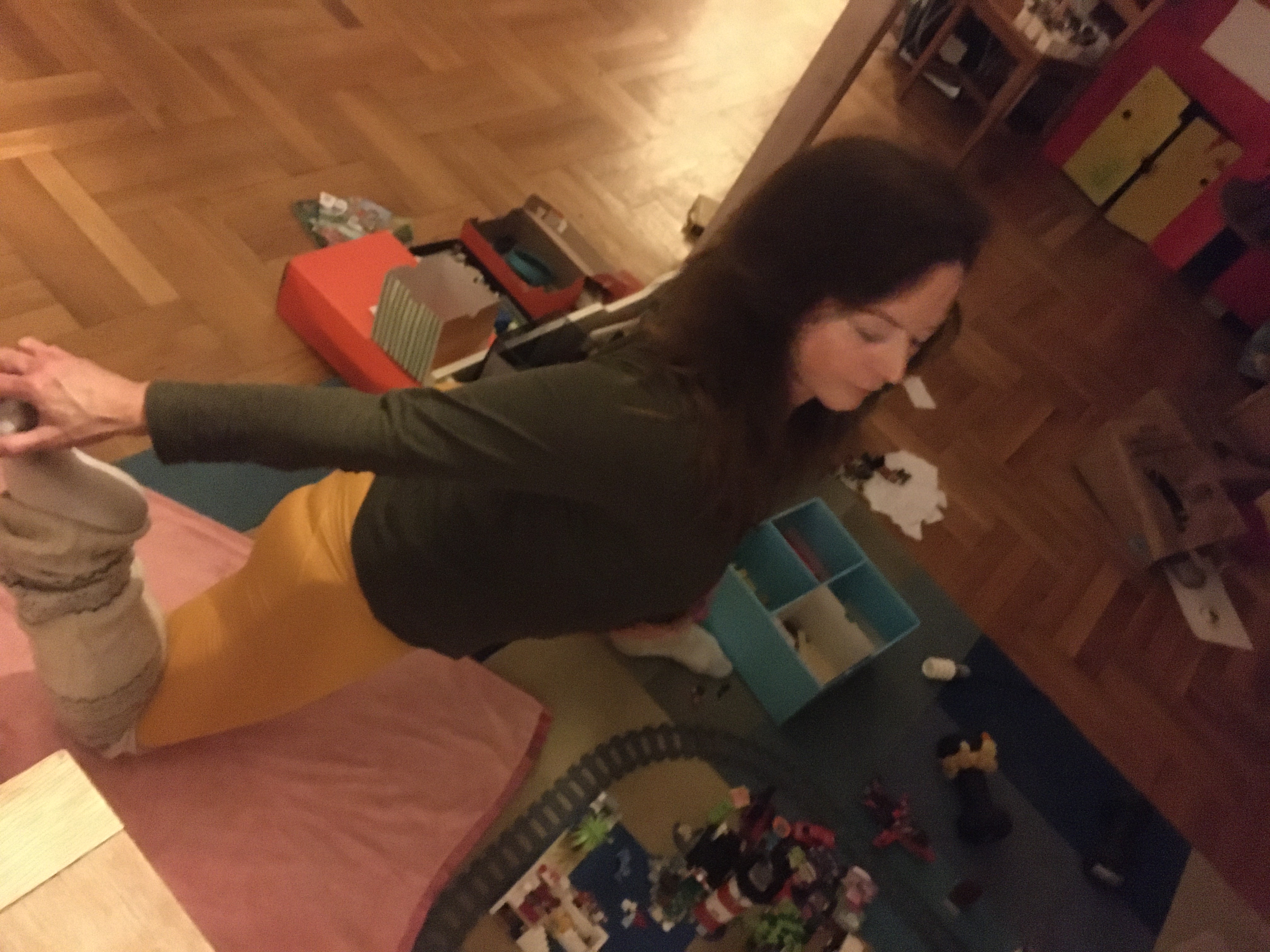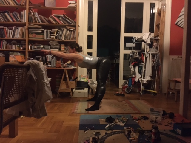 Este a mindenféle otthoni teendők, meseolvasás után nagy csöndben bő húsz perc tornázás: inga, guggolás, oldalemelés, hasprés, bicepsz; spárga, híd a végén. Épp csak átmozgatás.