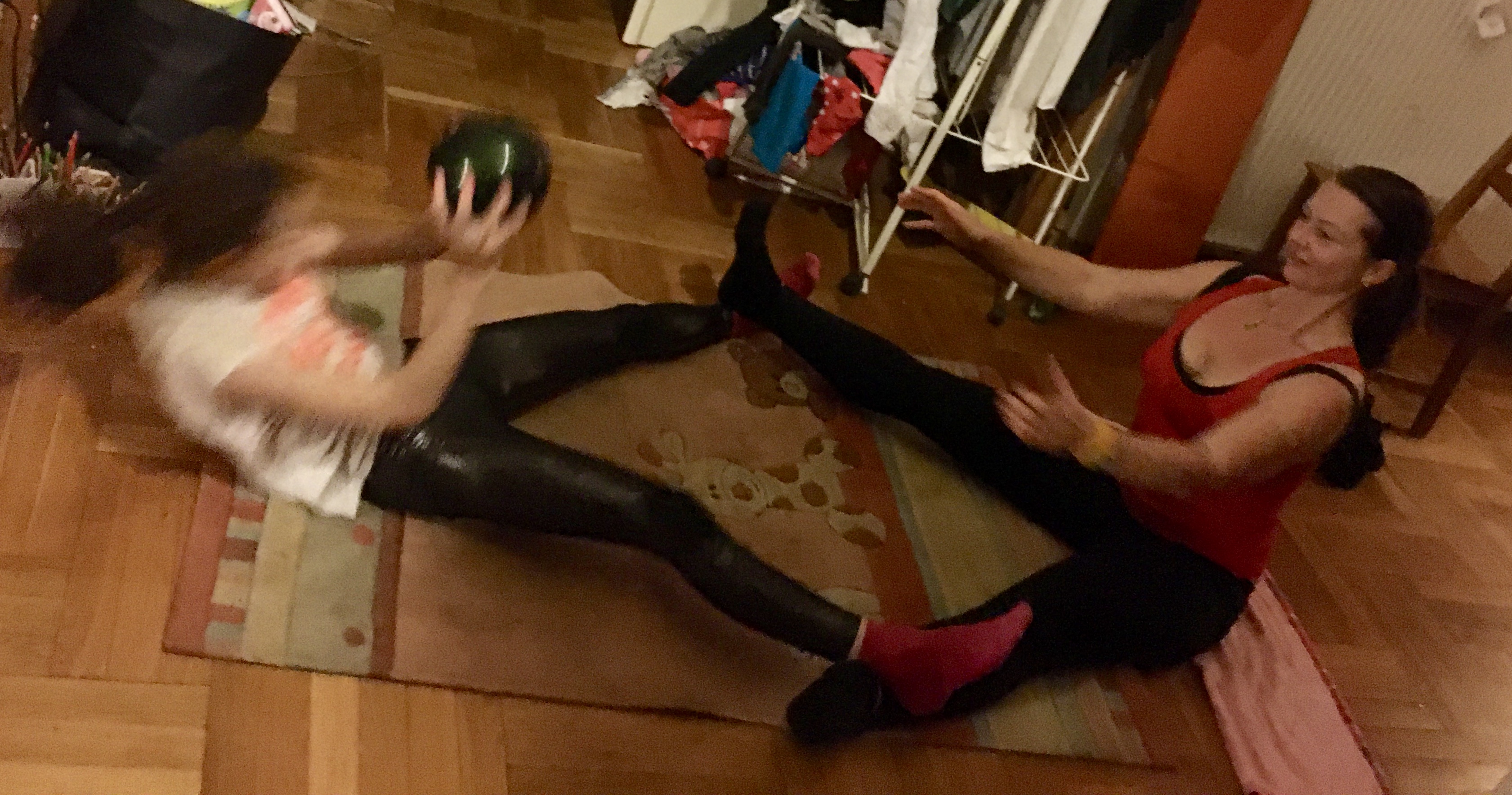 Fekve nyomok, tárogatok. 50-50. Leányommal hasizmozok, 25-25 felülés egymásnak dobott labdával.