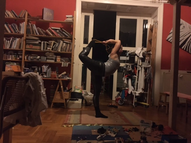 Hátam alatt babzsákszerű berendezési tárgy, sarkon ülésből hátraereszkedem, ez is fejlesztendő. Gondos nyújtás galambpózban is. De ma nem megy le annyira a spárga. Vannak áldott napok, és vannak nem. Azért a rávezető pózokat hosszan tartom.