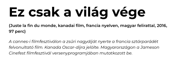 Mindhárom üt: az olasz nagyon vicces szerzői önarckép, én sokat röhögtem. A magyar most a nagy filmünk, a friss must have, sztárparádéval. Itt olvashatod el, hogy látják a témáját külföldről (elírták az egyik karakter nevét és a színésznőt is). Október 5-től lesz a mozikban.
