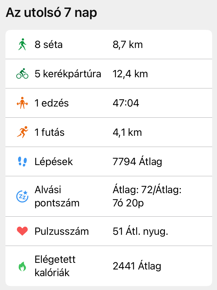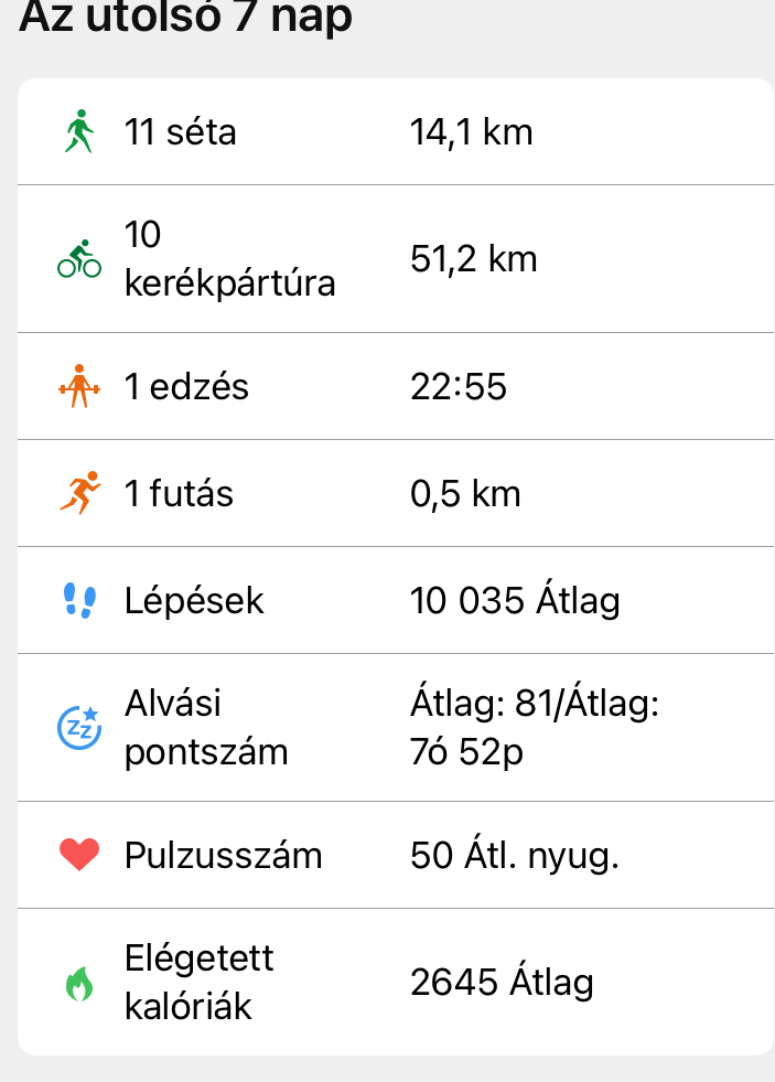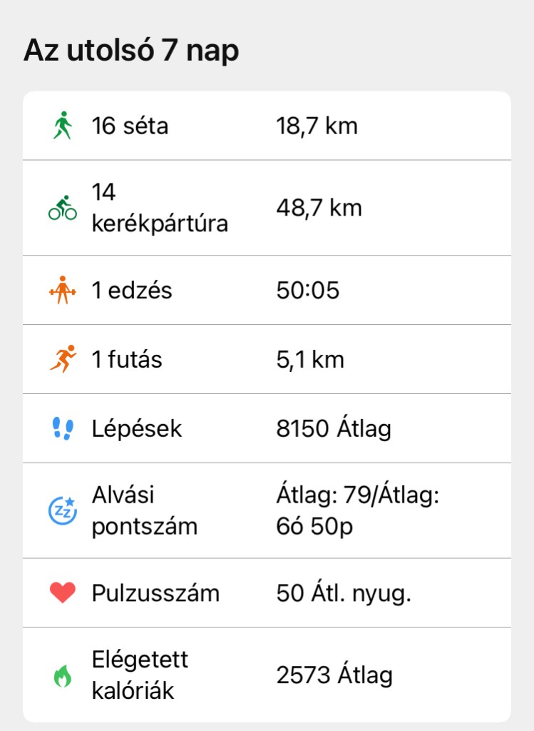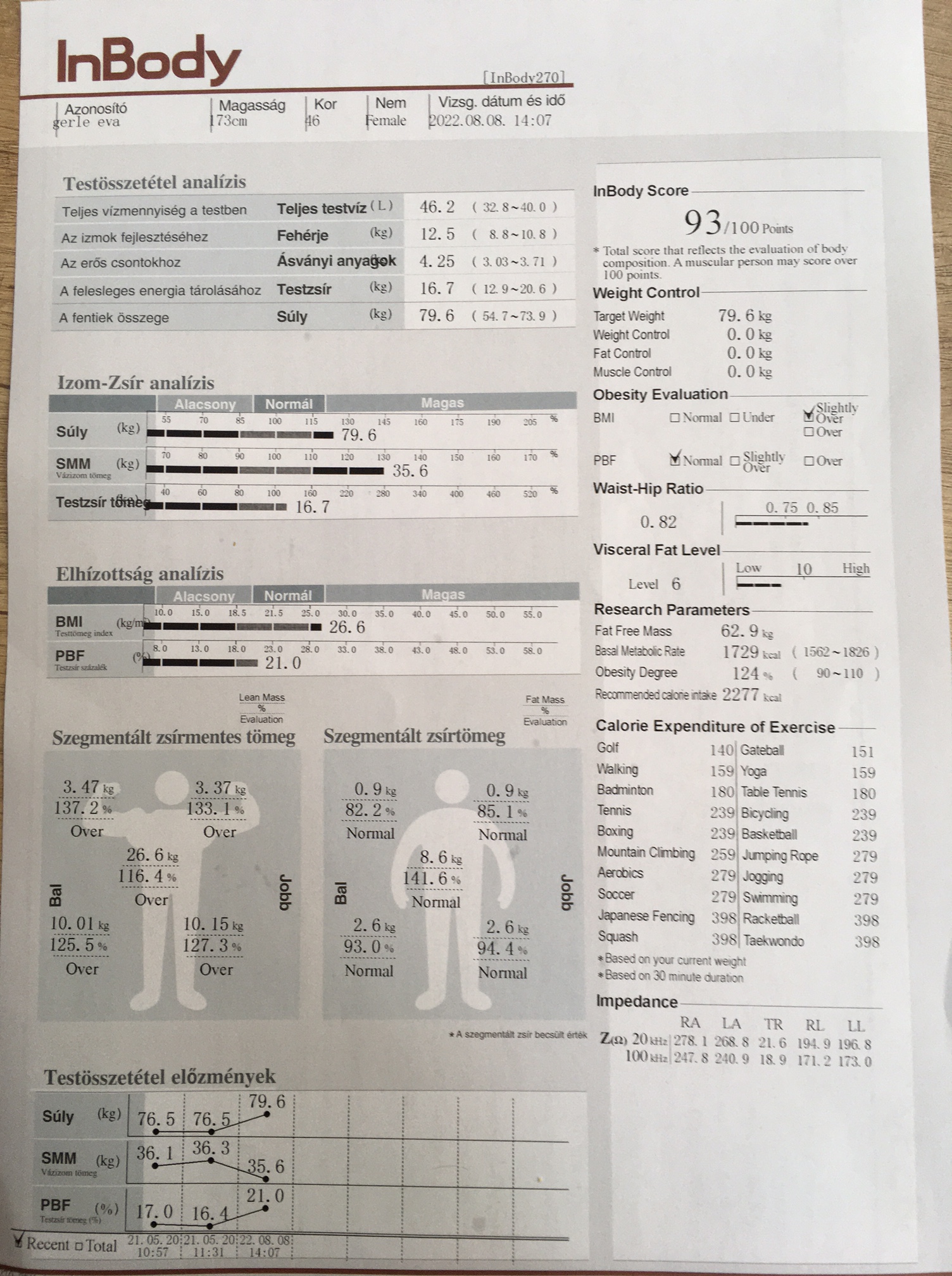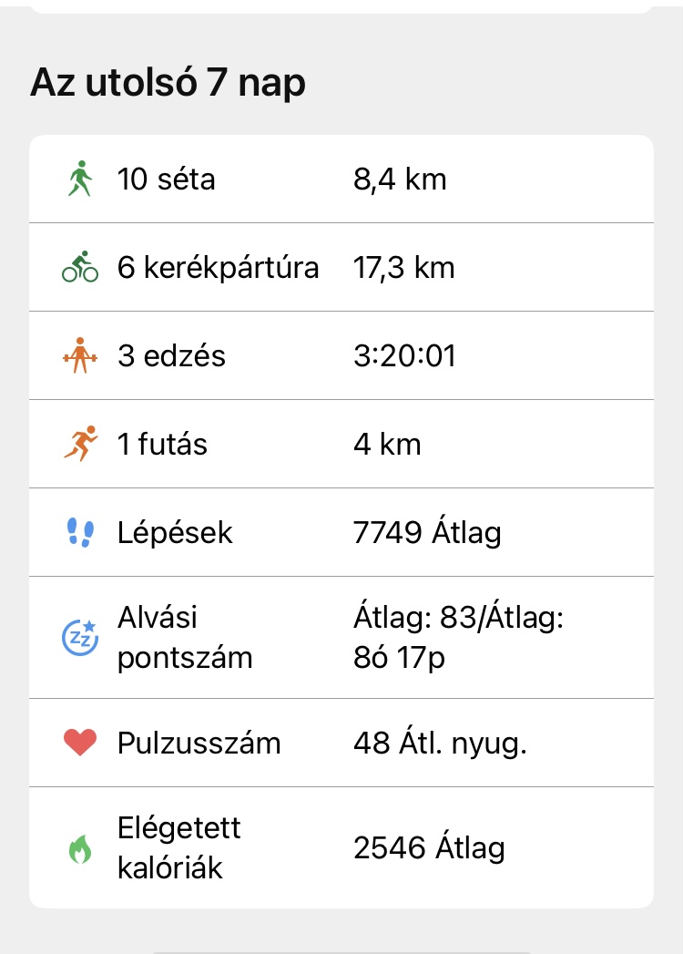 Szűk fél év, és 50 leszek. Valami változott: magasabb a nyugalmi pulzusom nyár óra (a makacs 46-49 helyett 54-56), kicsit (110/70-re kb.) emelkedett a vérnyomásom, enyhén a szemnyomásom is (a dioptria és a cilinder maradt, nem kell multifokális kontaktlencse, könnyen olvasok). Az étkezésemet nem tudom szénhidrát, sőt, liszt nélkül most elképzelni, de nem eszem túl sokat belőlük, és még mindig preferálom az értékes fehérjét, és kerülöm a feldolgozott kajákat. Nem fontos az evés, csak akkor eszem, ha éhes vagyok, meg ha épp van valami finom, esetleg elémteszik (családi bulin csirkepaprikás, málnás túrótorta, pezsgő!).