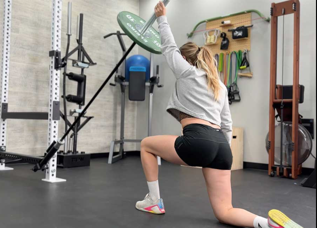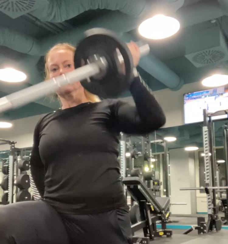 16 kilós emelgetése, bicepsz-váll-hát. 5×25 haskerék. Állva: oldalemelés, bicepsz, vállból nyomás, előreemelés. Egyszer a külsőcombos, beleguggolós gépen egy sorozat. A combot, feneket nem látja, a fűrészelést, tárogatást és súlyzós nyomást nagyon: