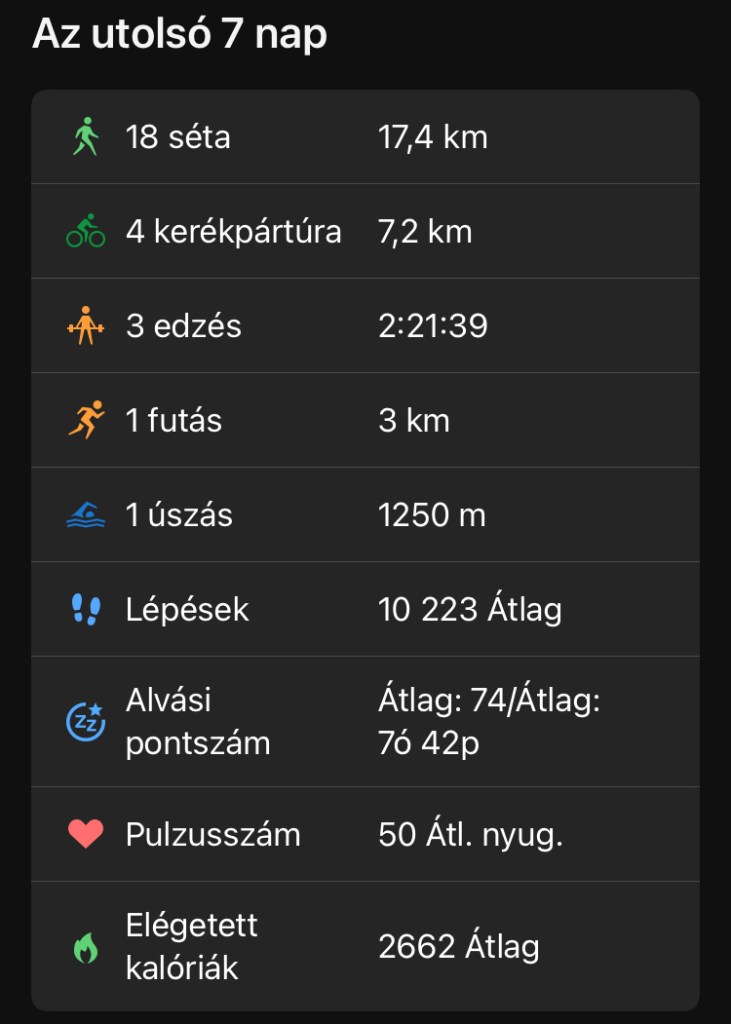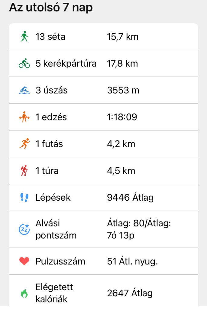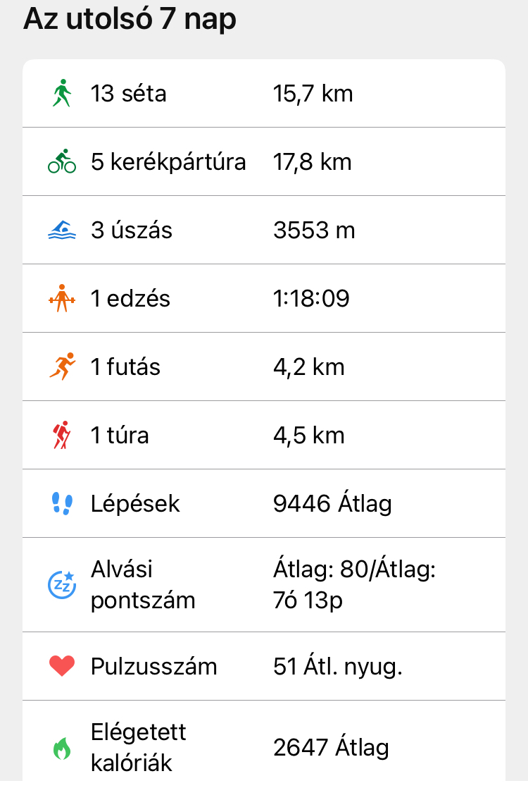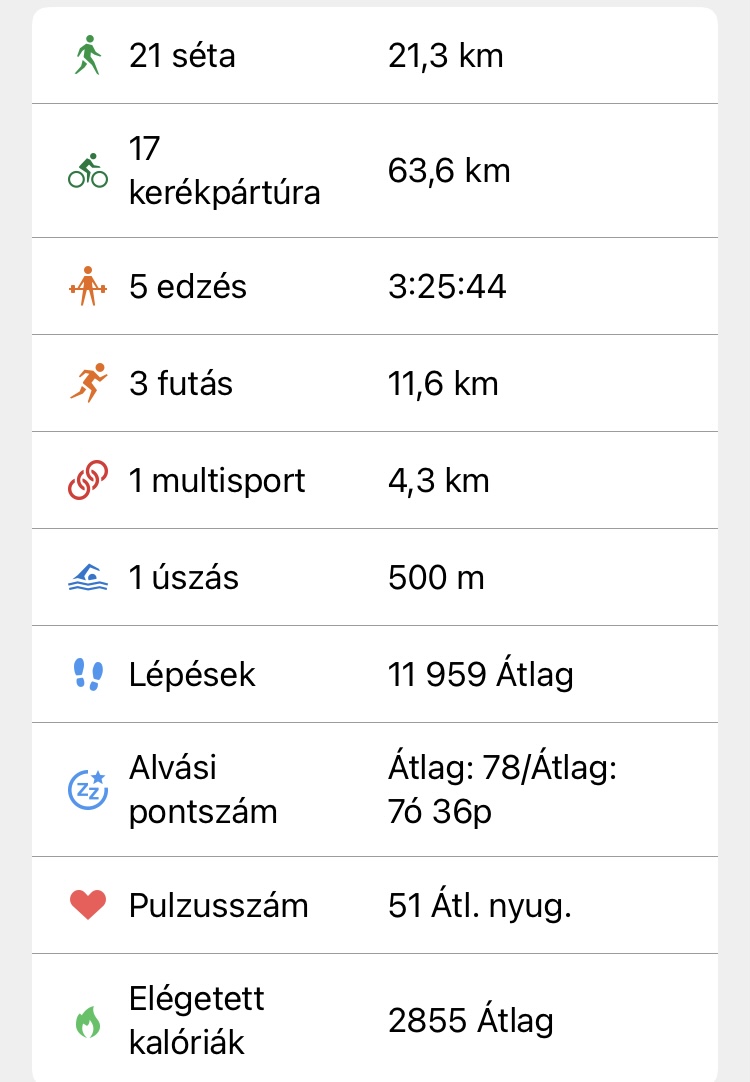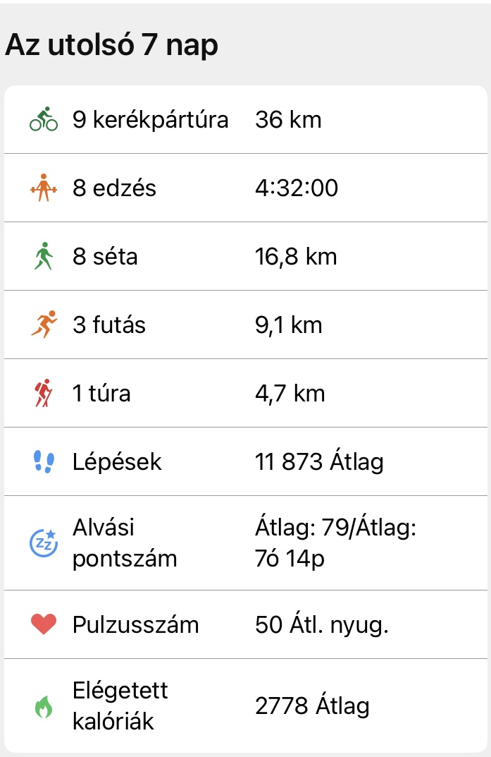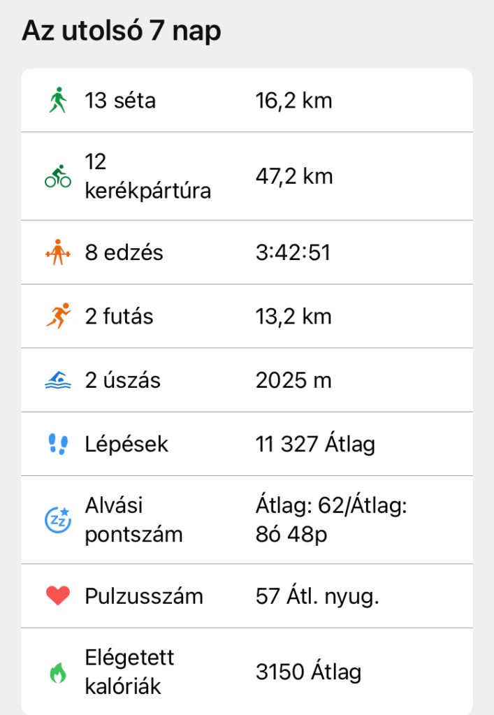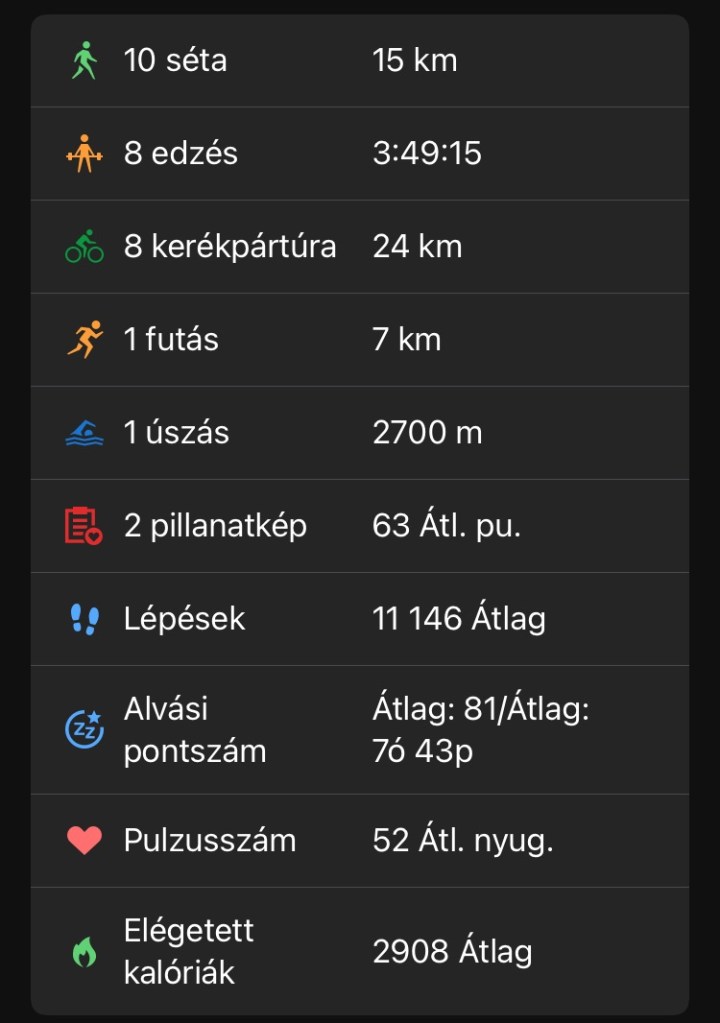 Ez volt a hét (nem úszhatok, nem futhatok még, szépen gyógyul amúgy, csak a jód összefogta). Abban a tizenkét edzésben a napi járkálás és a szauna is benne van kardióként, igazi izzadós-izomgyötrős négy.