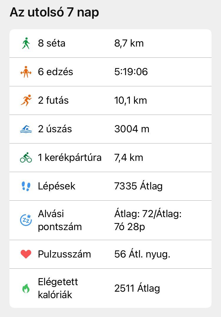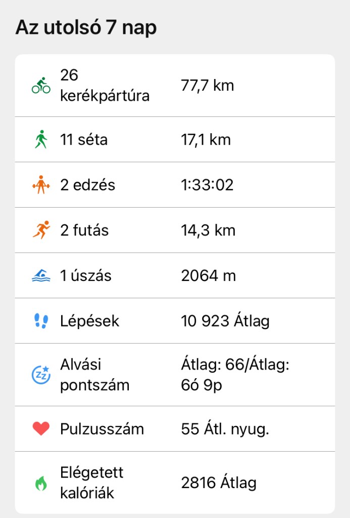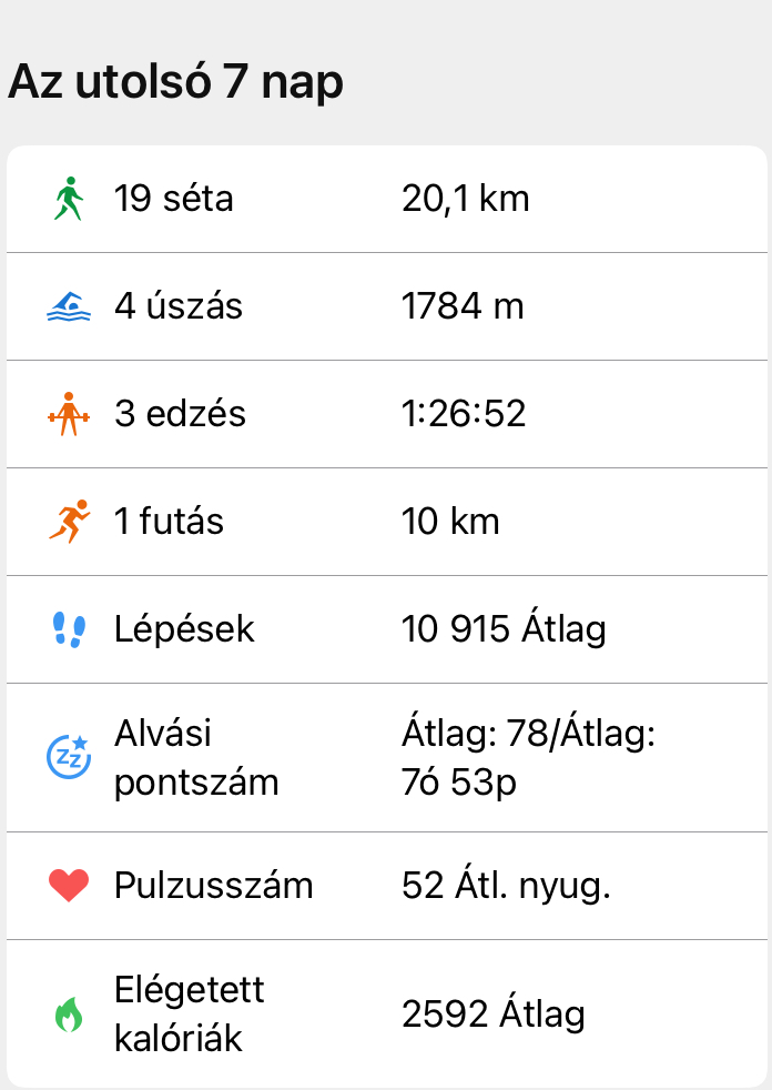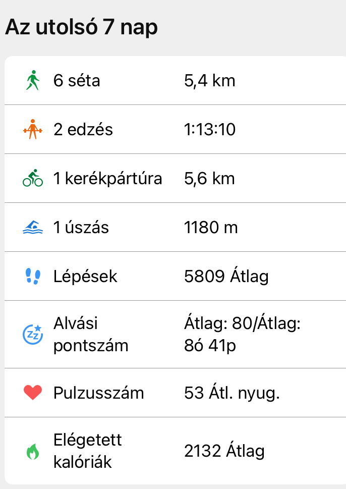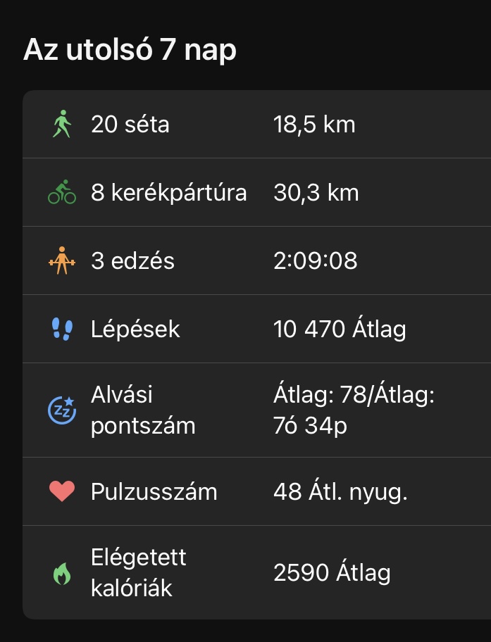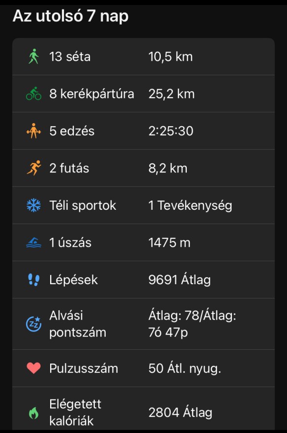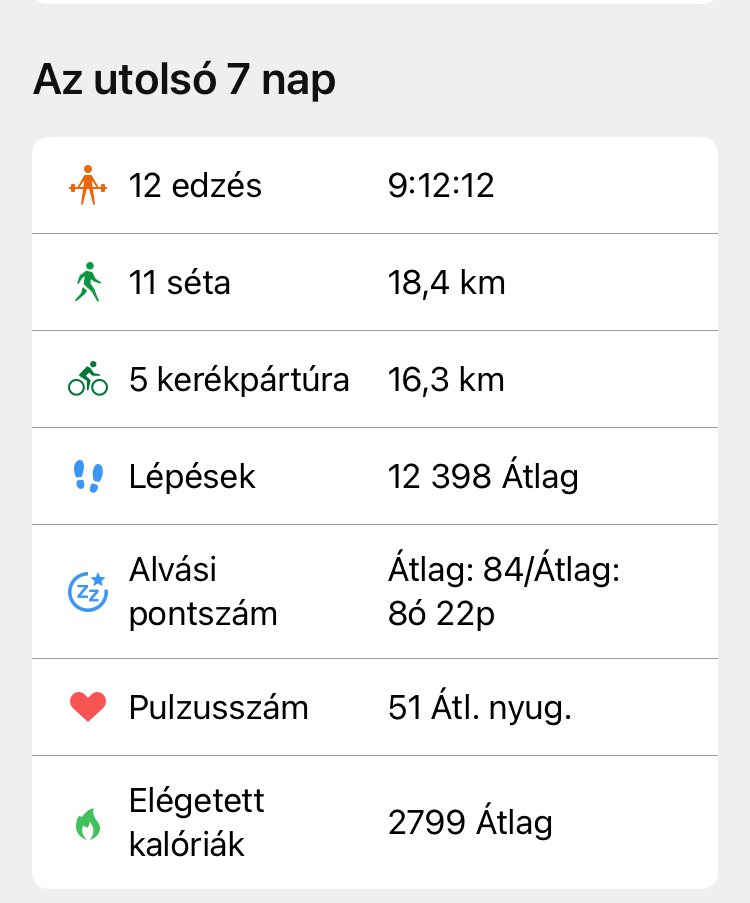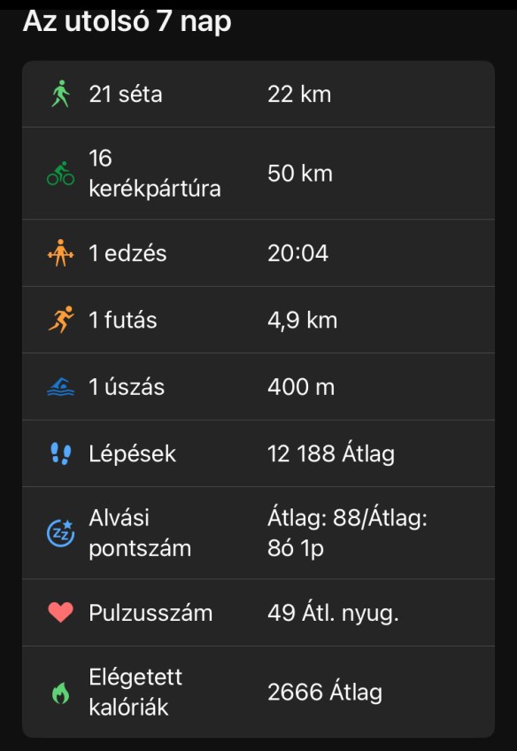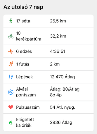 Ez volt a hét (nem úszhatok, nem futhatok még, szépen gyógyul amúgy, csak a jód összefogta). Abban a tizenkét edzésben a napi járkálás és a szauna is benne van kardióként, igazi izzadós-izomgyötrős négy.