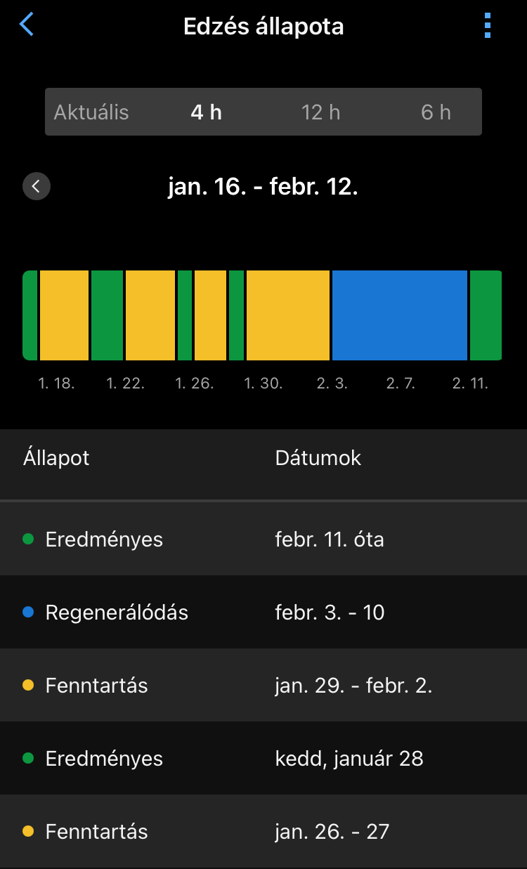 Az elmúlt hetek edzésintenzitás szempontjából. A sárga: maga az élet, bringa, jövés-menés. Egyik sem izzasztott meg. A kék a teljes pihenés, amikor legfeljebb 3-4000 a lépésszám.