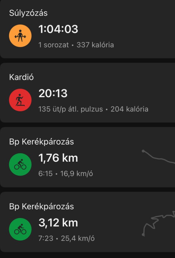 12 nap, 12 edzés, legalább húsz perc alkalmanként. Közlekedési bringa és séta nem játszik. Ma 58 perc nagy súlyos edzés, kilenc körben, mind szuperszett, 8, 16 vagy 24 ismétlés. Előbb a felsőtest, de közben has és fenék, comb, ahogy odaférek (most közepesen sokan vannak).