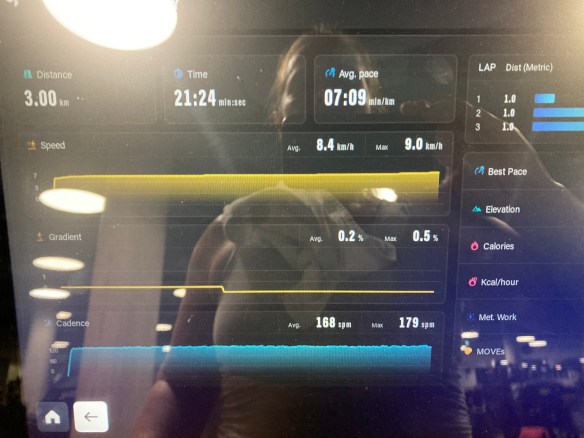 Utána futópad: 2 km gyors séta emelkedőre (3%, 6,4 km/h), három km futás (8,2 km/h, semmi túlzás, 0,4 km gyors séta és a vége, 0,6 km kocogás 7,8-cal, a jobb sarkamat érzem, meg nagyon merev a vádlim. A térdem nem fáj, az sose fájt, és most a térd alatti, külső ín sem, ami nyáron és ősszel volt. De ez a lassú, sétával kombinált 6 km a szintem most ennyi kilósan, ennyi kihagyás után.