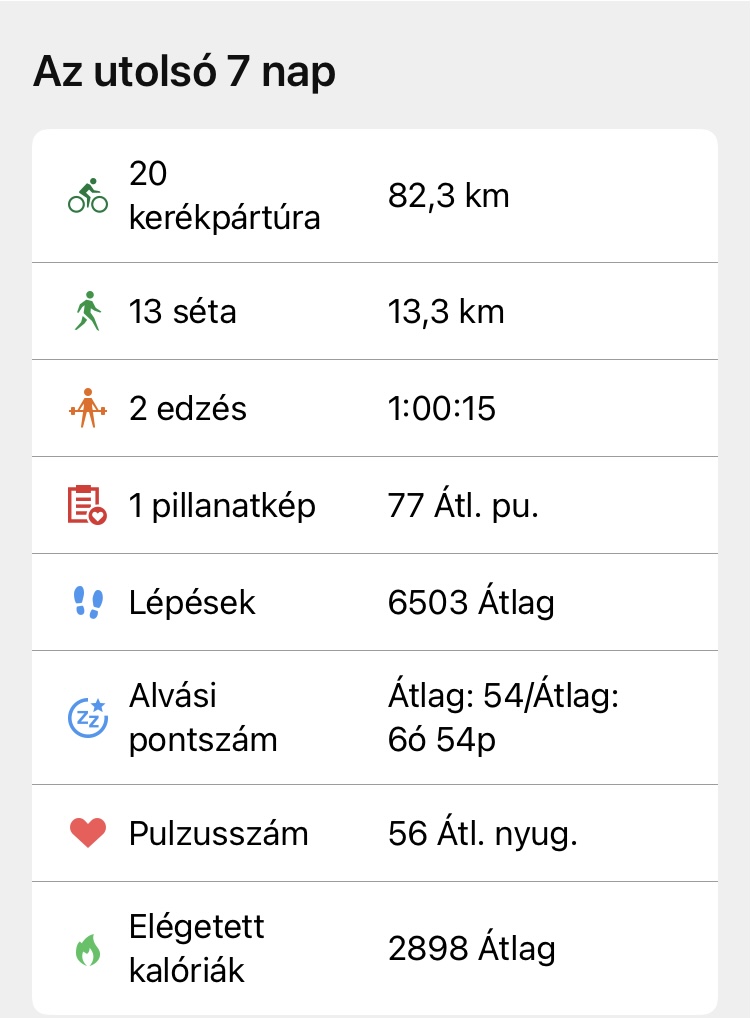 Utána bő egy óra nagy súly, guggolás, oldalra emelés, bicepsz, inga, vállból nyomás, rengeteg lépés, összesen 15 eze fölötti. A hétvégén erős izomláz. Pihenjek, könyörög Hermina. Edzésterhelés: 489! Az a szomorú alsó vonal: a betegség napjai.