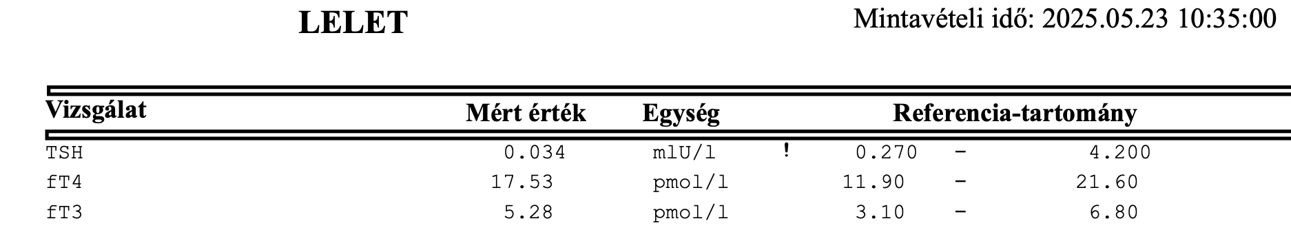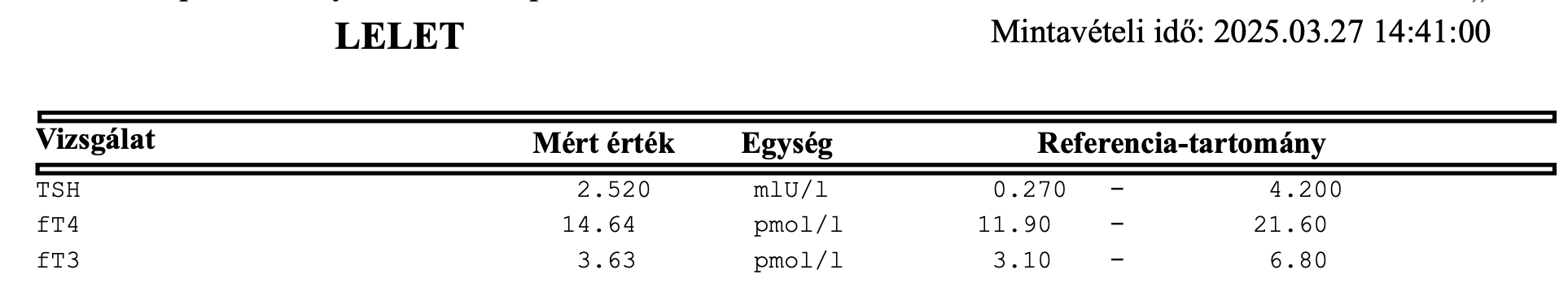 Vérvételem eredménye csodás: kicsit lehetne több vasam és vörösvértestem, viszont alacsony TSH, közepes T4 és T3, semmi fertőzés.