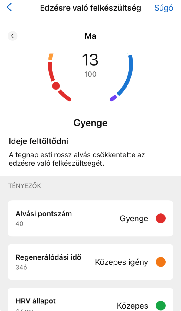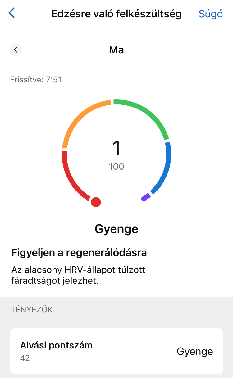 Pedig extrém rossz alvás, kevés és nem pihentető a Garmin szerint, valamiért 6 órára datálja az ébredést, óva int az edzéstől, 40 óra regenerálódást ír elő, és nem jelez álmot. Késő este töltöttem az órát, mert hazafele a bringa közben lemerült. Nem érzem gáznak az alvást. Reggel szép, 5,0 vércukor.