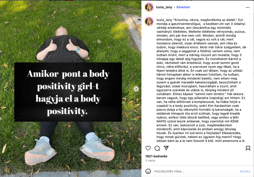 Szóval én nagyon örülök, hogy ez a forma ki tudott jönni a testemből. A járvány sem törte meg, sőt, boldogan és rengeteget mentünk kutyával, kísértem a fiamat suliba, visszakapaszkodtam a meredeken. Erre az állapotomra írtak agresszív kíváncsiak, hogy ez nem forma. Nekem ez a forma az ideális, bárki bármit kiabál, és a testemről én döntök, nem kértem – a kéretlen tanács rosszindulattal, hazugságokkal a legcikibb kombináció.