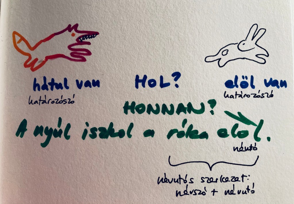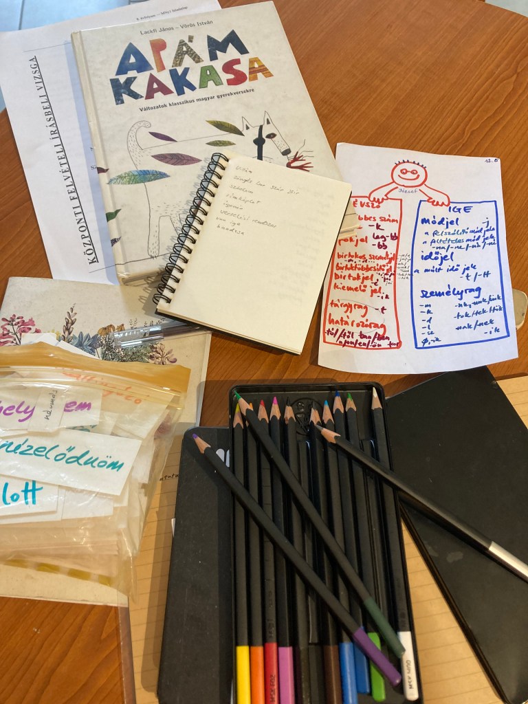 Előtte duplaóra Budán, nyolcadikos. Gyorsan kell haladni, mert decemberben kezdte, nagy lyukak vannak, ez meg is terheli. Felírom neki az öt témakört. Helyesírás (ez nulladik, minden órán van), utána hangzótörvények, szóelemek, szófajok, mondatelemzés, szólások-közmondások. Mindenből egy kicsi, folyamatosan együtt kell az összeset, mert a fogalmak gyorsan fakulnak. Szépen címet, dátumot írunk fel. Csak attól működik az egész, ha szeretem a gyereket, kölcsönös pedagógiai szeretet van és semmi határátlépés. Idén könnyű dolgom van.