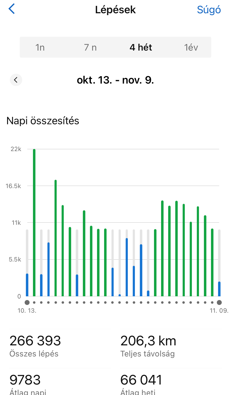 November 20-23. Cserediák fogadása, csak gyaloglás, de abból sok, mozgalmas. 10-16 ezer lépés, kivéve vasárnap, így 23 egymást követő nap volt csak meg a minimum 10 ezer.