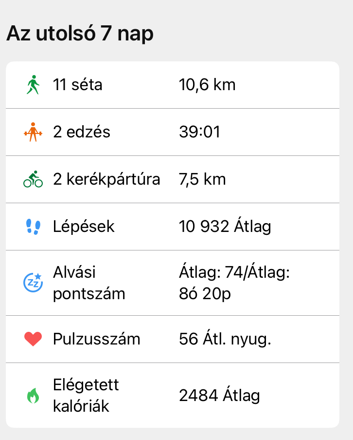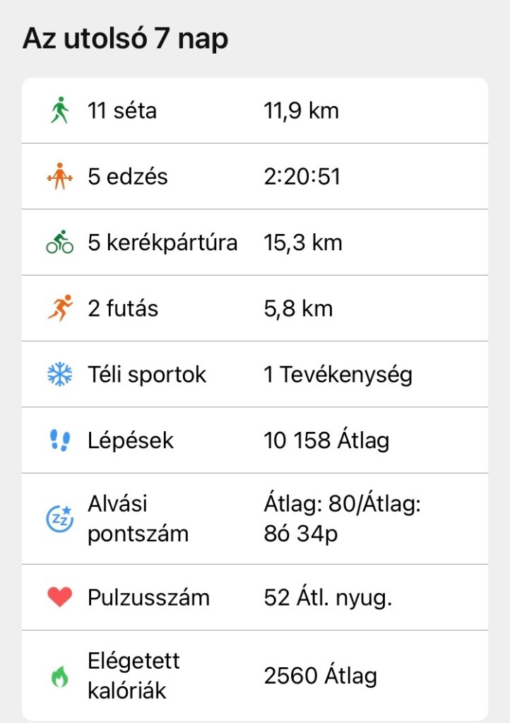 Ez a hét, most (csütörtök reggel) fotóztam ki, mert az előzőn, hétfőtől hétfőig végig takony, gyengeség, csak séta és lakásban körözés (kardió, az 5 edzés között) volt.