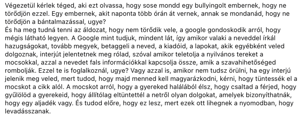 És látjátok, ez lett. Akik sokat hazudtak, manipulációval és technikai trükkökkel szereztek követőket, ismertséget, azok, amikor lelepleződnek, arra kényszerülnek, hogy üvöltve hazudozzanak onnantól. Egész életükben, kivétel nélkül. És ezért zajlik most a nyomozás, és lehet megint áldozatot játszani. Egyvalamiért: annyira el vonatok telve magatokkal, a hergelt igazságaitokkal, hogy elhittétek, hogy én nem számítok, rám nem érvényesek a magyar törvények (!), én nem tehetek feljelentést, velem bármit meg lehet csinálni.