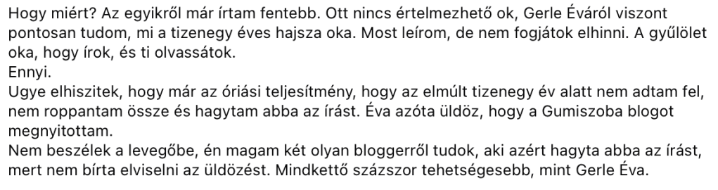Ezeket pedig, itt lent, Angéla írta ki most nyáron, június 1-jén, és én csak most olvastam. Dühödten gyaláz, megfordítja a sztorit, elhallgatja a koppintást, a dúlást a blogomon, a szélsőséges rajongását és nekem fejtegetett vágyakozását hírnévre, sikerre. A kölcsönkért 75 ezer forintot (2014-ben vagyunk). A kavarását, a Tamásnak való üzengetéseket, a fórumos mocskolódást, az olvasóim nyaggatását, a vad rágalmakat, kárörömöt, a leskelődést.