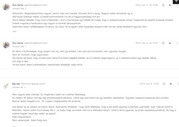 Nem értettem: ti hogy nem érzitek cikinek ezt… és én hogy mondjam meg, hogy szerintem szarok, amiket csináltok. Én a világirodalomról írok meg Rakovszky Zsuzsáról, Tar Sándorról, érdek nélkül, ti meg rajtam akartok pénzt keresni ilyen-olyan bóvlival? Ti mit adtok nekem? Szeretetet, rajongást? Olyat, mint Naja, Csilla vagy Angéla? Hülyének is megéri!