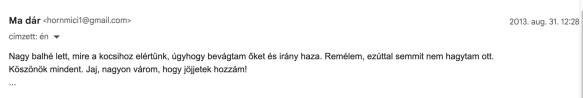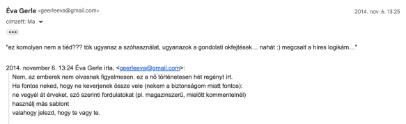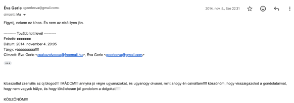 Ez a legviccesebb, durván kavarós nyomorult. Fogalmam sincs, ki ez, és még ha tudnám is, mi közöm lenne az élete, jó sorsa, családja, ingatlanjai alakulásához? Egyáltalán: mit érdekelne? Álnéven ír, bizalmaskodva emleget blogon látott embereket, a házát, karrierjét, a tőlem “elszedett” “barátokat” (nekem ők nem voltak a barátaim – itt az irigység, neki az kell, amit az enyémnek hisz), mindenféle élményeit, és ki akarja provokálni, hogy én irigylem és én pórul jártam, mert ő jól. Fortyogok, nyilván, bár azt sem tudom, ki ez, és nyilván felszépít mindent, célzottan dörgöl. és azért, mert fájt neki a sikerem. Hasonlóan zavaros álnevekről több tucat e-mailt írt, mindig lobogtatta magát, elégedett volt magával ellenem, regélt a megszerzett ingatlanról, amit nekem köszönhet, hahaha, most majd fáj ez nekem (???) – közben haverkodva-kedélyesen mesélt pl. a nőgyógyászokról, és mellette a legocsmányabb módon osztott ki, vádolt több gyilkossággal is – én nem tudtam, és ma is csak sejtem, ki ez (hazudott).