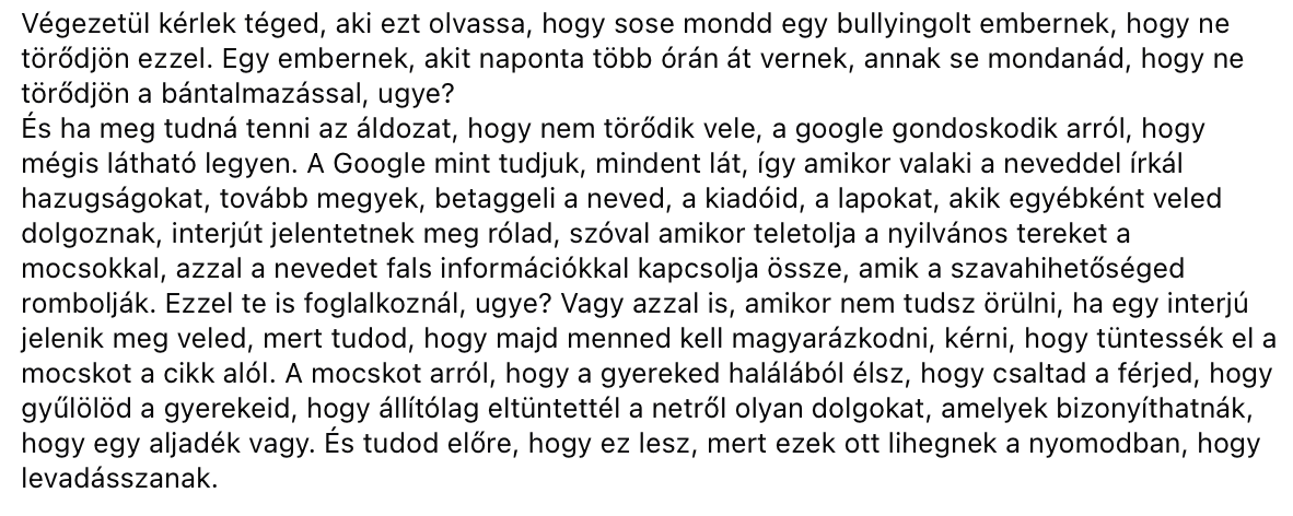 Az elmúlt hónapokban igen erős elgondolkodnivalóm volt, hogy le lehet-e neten járatni valakit. Mármint olyasvalakit, akinek nem reprezentáció, médiatülekedés, kellemesség, példány- és kattintásszám az élete, hanem valóban dolgozik. Amit így direkt mondtak, hogy nekem nem jó a hírem (teleírták a netet mocsokkal), és majd mindenki rámkeres, az ő zavaros vádjaikat fogják komolyan venni, és engem sehol nem alkalmaznak…