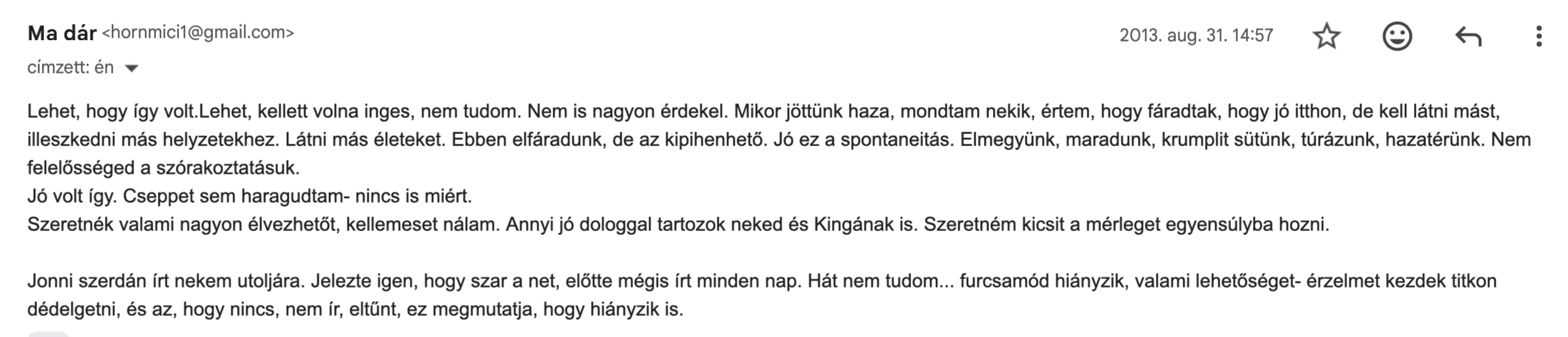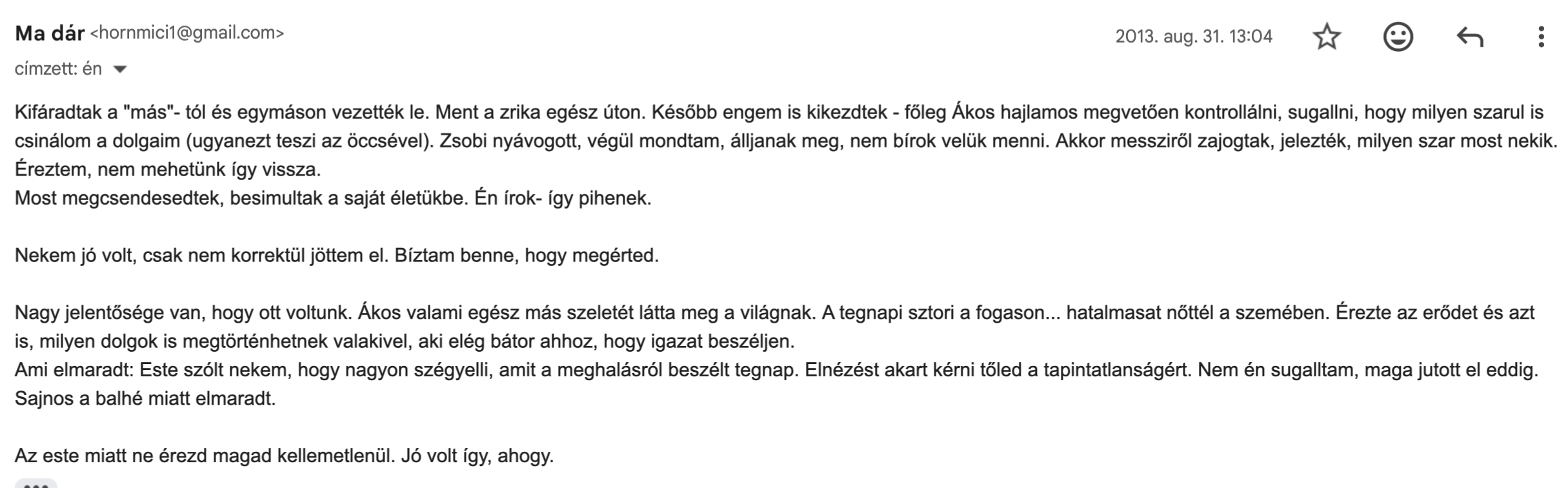 Továbbá nincsen semmi bizonyítékod, Angéla, hogy én írtam volna álneves vagy bármilyen e-maileket Szentesinak a párkapcsolatáról. Minthogy én nem írtam Szentesinek a párkapcsolatáról, és amikor újra belevetette magát a rákba, akkor meg egyáltalán nem írtam semmit neki, egész életemben kétszer, 2023 novemberében és 2024 februárjában írtam neki. És ő ezt tudja, első tudatosan keni rám az álneves, rontott helyesírású leveleket,