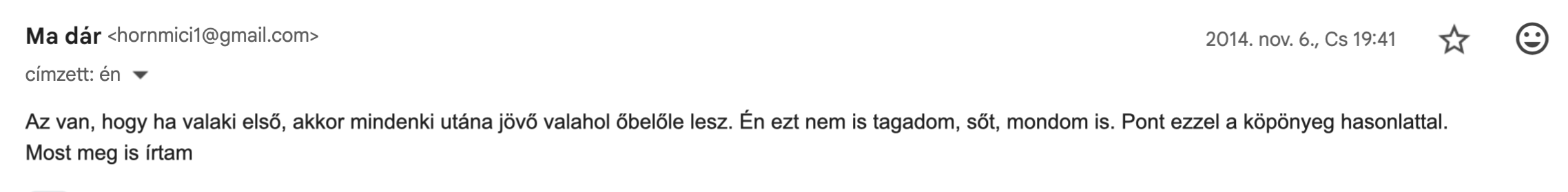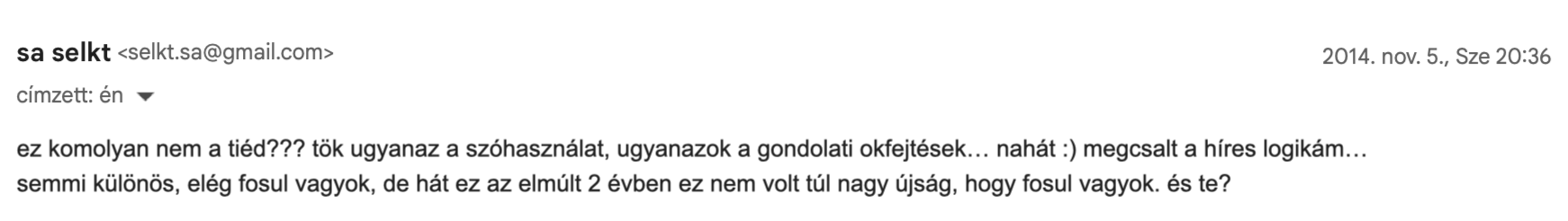 Ez a legviccesebb, durván kavarós nyomorult. Fogalmam sincs, ki ez, és még ha tudnám is, mi közöm lenne az élete, jó sorsa, családja, ingatlanjai alakulásához? Egyáltalán: mit érdekelne? Álnéven ír, bizalmaskodva emleget blogon látott embereket, a házát, karrierjét, a tőlem “elszedett” “barátokat” (nekem ők nem voltak a barátaim – itt az irigység, neki az kell, amit az enyémnek hisz), mindenféle élményeit, és ki akarja provokálni, hogy én irigylem és én pórul jártam, mert ő jól. Fortyogok, nyilván, bár azt sem tudom, ki ez, és nyilván felszépít mindent, célzottan dörgöl. és azért, mert fájt neki a sikerem. Hasonlóan zavaros álnevekről több tucat e-mailt írt, mindig lobogtatta magát, elégedett volt magával ellenem, regélt a megszerzett ingatlanról, amit nekem köszönhet, hahaha, most majd fáj ez nekem (???) – közben haverkodva-kedélyesen mesélt pl. a nőgyógyászokról, és mellette a legocsmányabb módon osztott ki, vádolt több gyilkossággal is – én nem tudtam, és ma is csak sejtem, ki ez (hazudott).