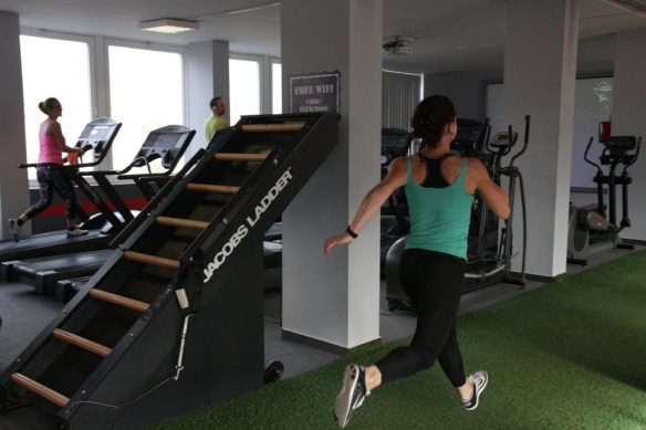 Aztán húsz perc lépcsőzés, 8-as fokozaton, ötpercenként egy-egy perc 7-es (“pihenő”), rendkívül megizzadtam: