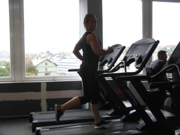 Megyek terembe, futópad (10 km, gyaloglásnak indult, de két km 5,8-as gyaloglás után kocogok. Aztán három-négy perc séta. Mindig ez van: kardiónak állítom be az órán, mert “ez csak séta”, illetve most nem akartam a hétvégi durva gennyes-taknyos kórság után terhelni még, aztán erőre kapok, elkap a lendület, és futok, persze csak max. 9-cel, az átlagsebesség 7,1 lesz). Húsz perc nyújtás.