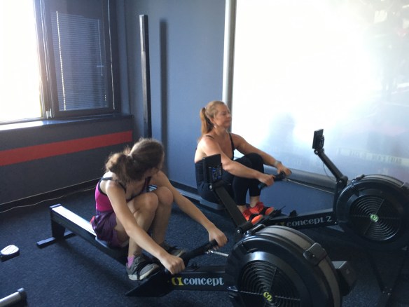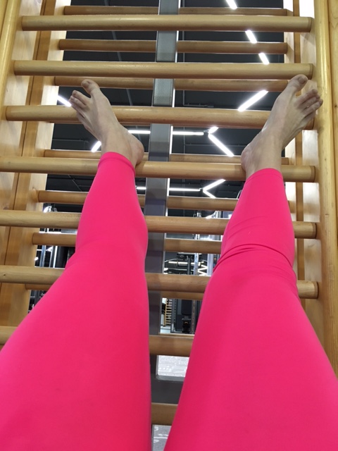 Délután gyors, intenzív edzés: 39 perc, három kör, kevés gyakorlat nagy súllyal, kevés ismétléssel: merev lábas felhúzás, fej fölé vitel, elöl tartott súllyal guggolás, inverz fekvőtámasz (rúdhoz húzom fel magam), kézenállás, magas korláton hátrahajolva hasazás, innen felülés: