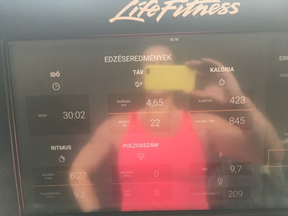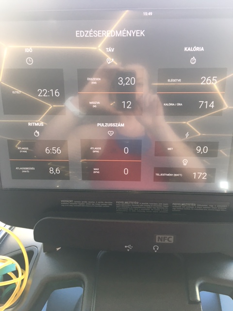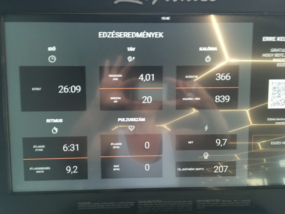 Utána futás padon, 60 perc 14 másodperc, 9,66 km, 700 kalória. 8,5-8,8-as sebességgel kezdem, majd megyek hosszan 9,4-9,5-re, 9, 8 is egy darabig, mad 10,2 és az utolsó percekben 11,5, 12 km/h. Nagyon megizzadok, büdös leszek.