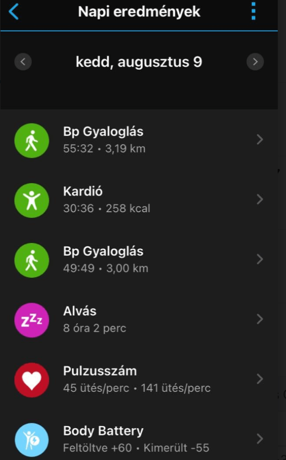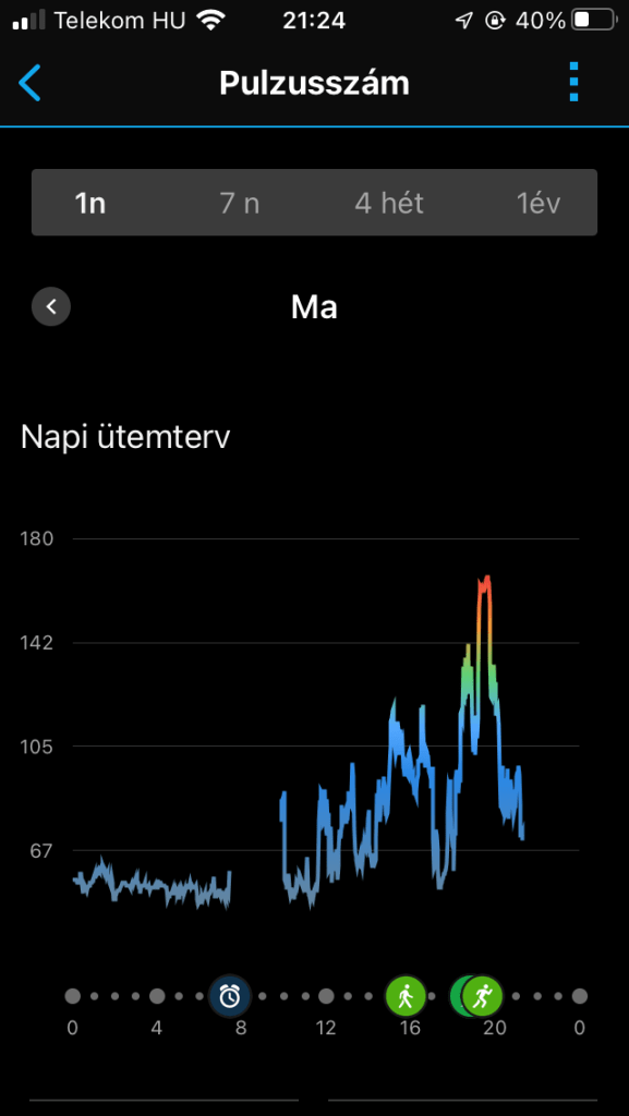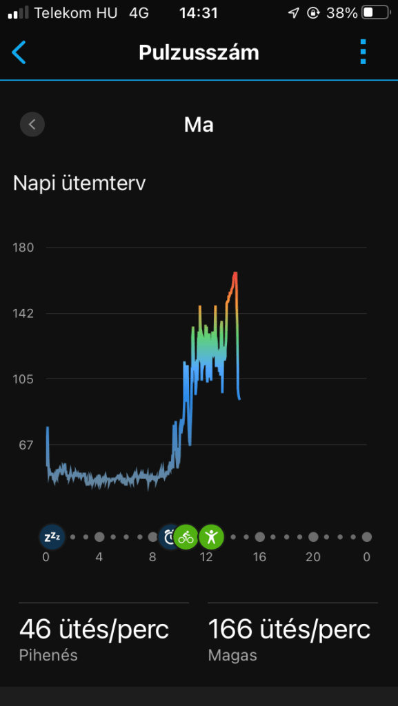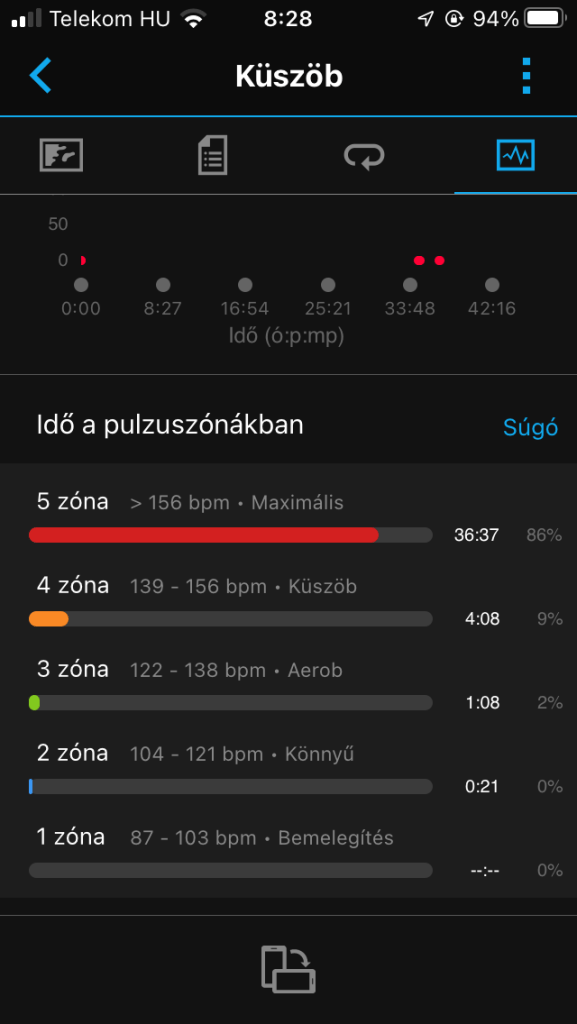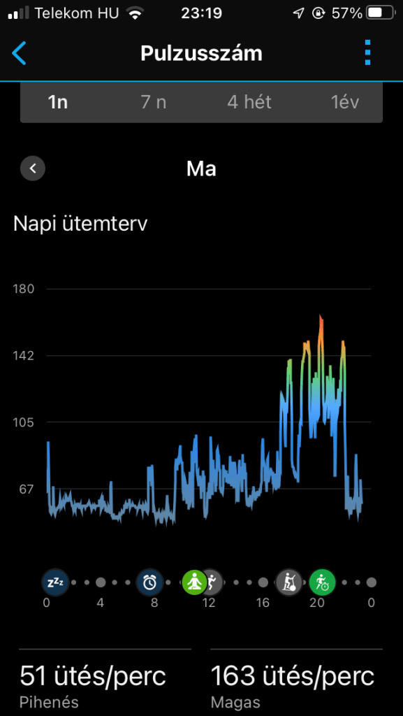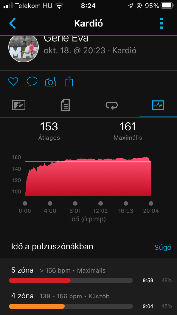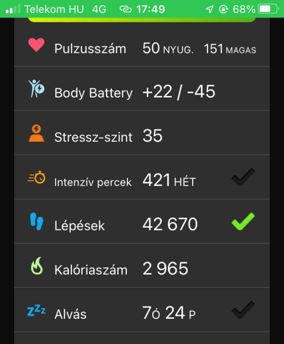 Egy érdeklődőnek a Garminról: ha nincs kellő pulzus, akkor nem számol intenzív percet, pulzus meg csak a mozgástól lesz. Akkor is intenzív percnek számolja, ha érzékel magas pulzust, de ha nem indítottam aktivitásként az órát (ilyenkor a move iq-val vélelmezi, mi zajlik), de ha elindítom mondjuk ülve, hogy séta, és nincs pulzus, akkor nem fogja intenzitásnak számolni. Nem hamisítható. Ez a lényeg, hogy 50% fölötti zóna (87+) kell tartósan.