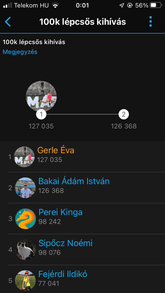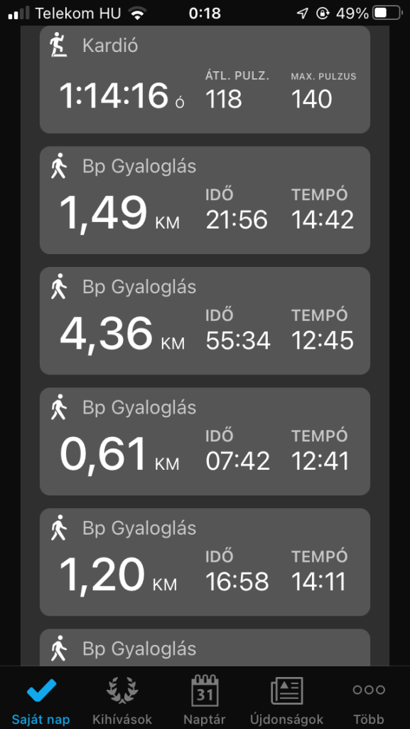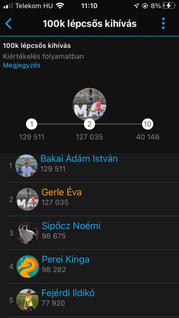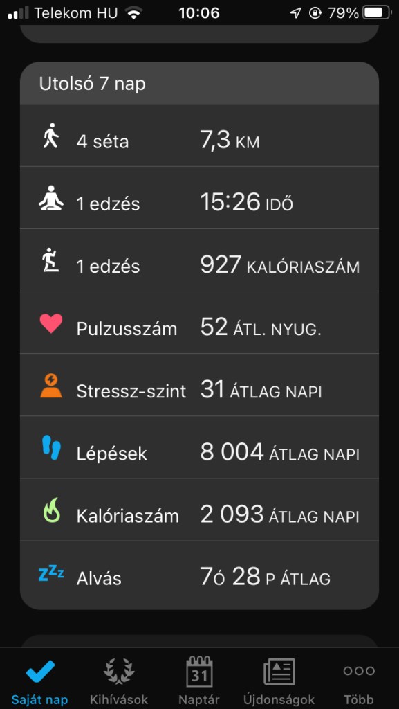 Aztán este még a lakásban mászkálás, súlyzókkal bicepsz, oldalemelés, guggolások, húszezer lépés, mert a lépésszám is alacsony volt a héten, és hatodik helyre szeretnék feljönni az eheti (80 ezres) lépésszám-versenyben (végül Dáviddal olvasónapló meg lelkizés után bealszom), 73314 lépés az eheti, a hatodik is belehúzott még, így maradok hetedik.
