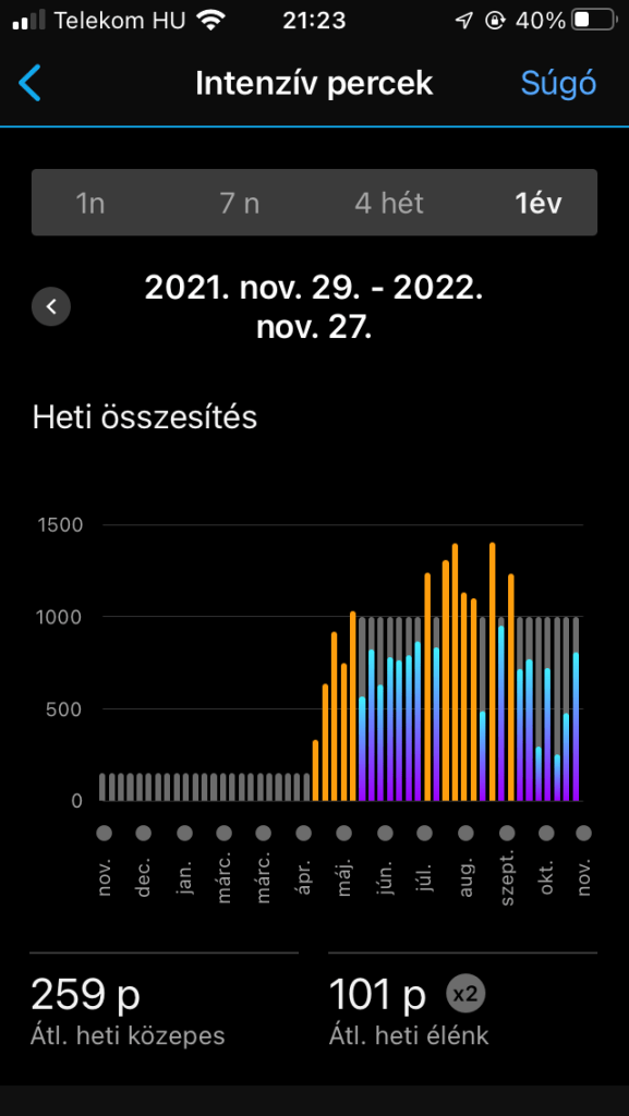 megj.: én 1000 intenzív percet állítottam be az első hónap után, annak tudatában, hogy a 3-as zónától élénknek számolja és kétszeresen. Az alapbeállítás 150 perc.