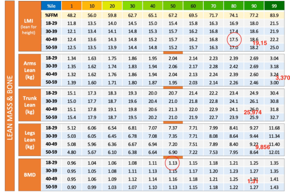 46 éves nőként így alakulnak a percentiliseim a legutóbbi (okt. 7.), nem épp fényes formát mérő DEXA-vizsgálat adatai szerint. Mi az a percentilis? Száz, korosztályban, nemben egyező alany közül hánynak alacsonyabbak az értékei az enyémnél.
